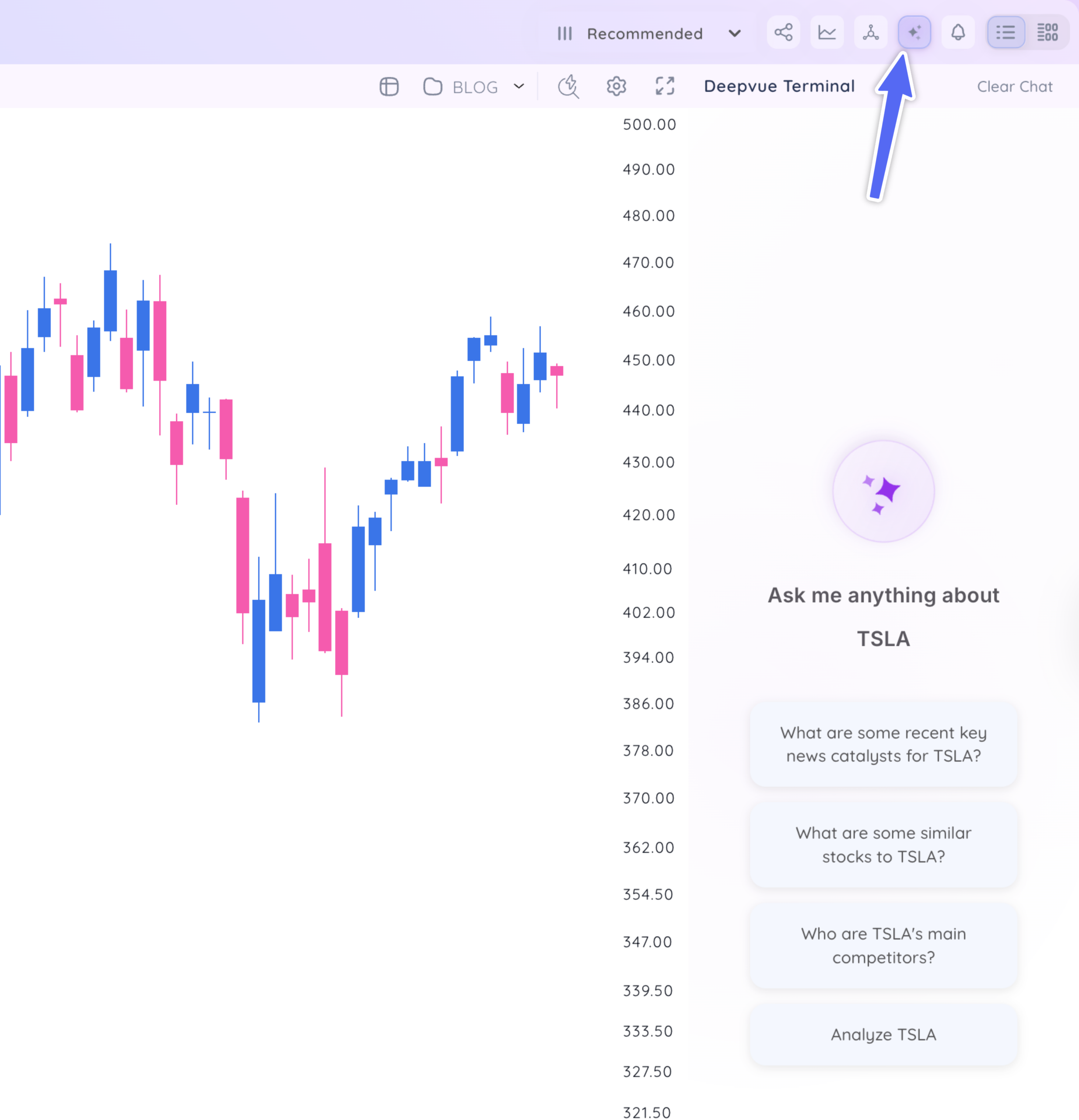 In the top right of your Watchlist or Screener, click the AI Assistant to open the Deepvue Terminal.