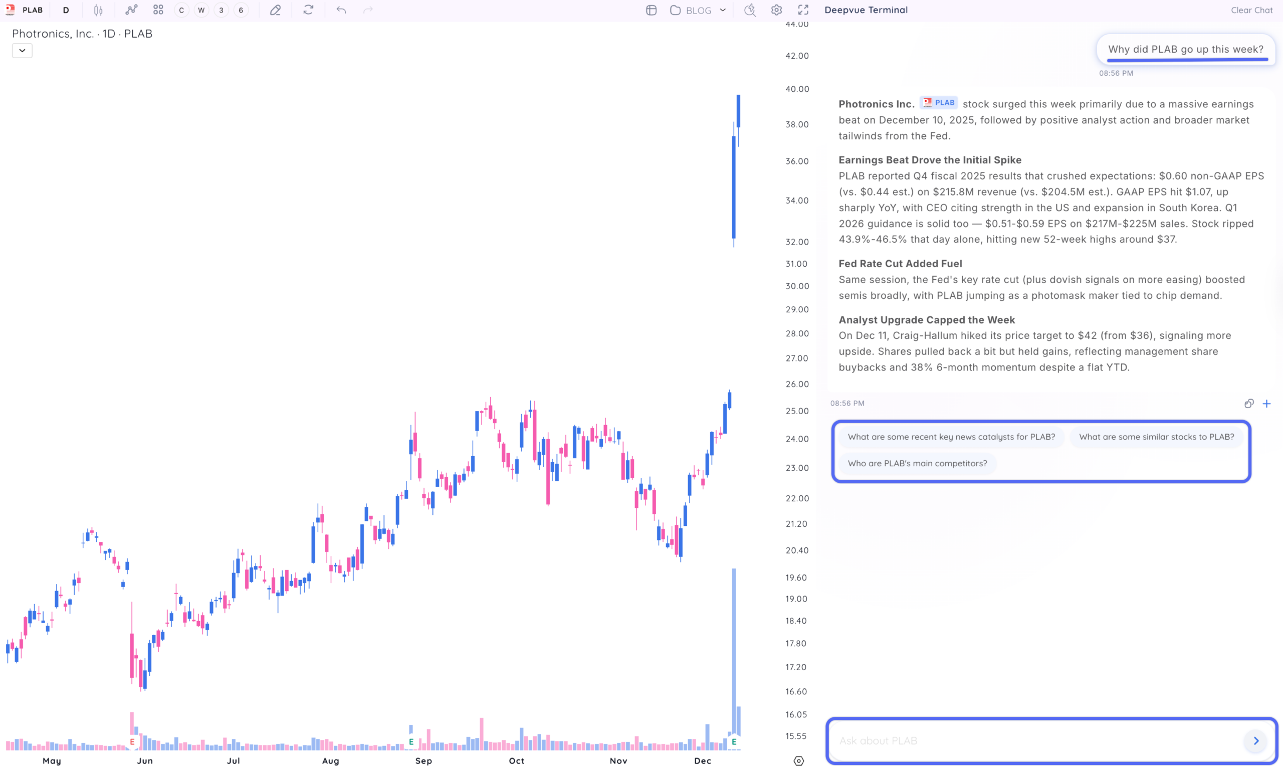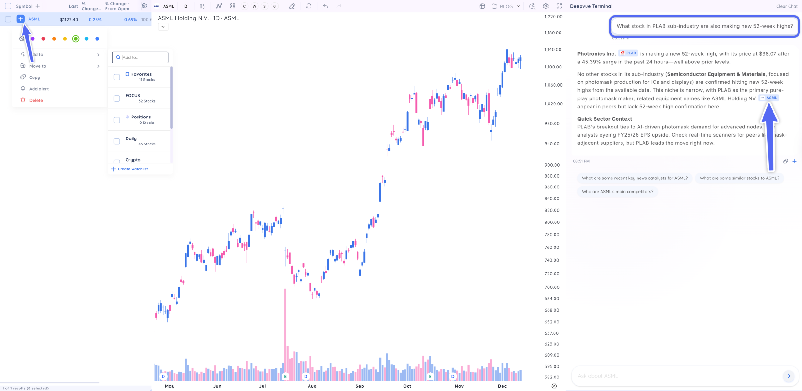 Start with the sample queries above, explore similar stocks to your current winners, and use clickable tickers to build better watchlists faster. With Deepvue AI, you’ll never again be left wondering why a stock gapped or whether it’s likely to hold.